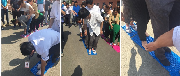 早上9點(diǎn)整,參賽隊(duì)員在起跑線上做好準(zhǔn)備,參賽人員共24人,每組4人,共6組,每組4塊趾壓板,分為兩輪進(jìn)行比賽,用時(shí)最短者為勝。由裁判張水平副總經(jīng)理發(fā)令后,游戲開始,從最后一名組員開始把趾壓板傳遞給第一個(gè)組員,隊(duì)員開始依次踩著墊子往前走。