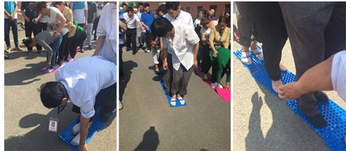 痛并快樂(lè)著,團(tuán)結(jié)又協(xié)作,腳踩指壓板,廠(chǎng)慶心歡樂(lè)。