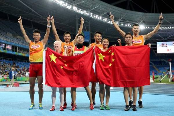 圖為中國隊在田徑女子4x100米T11-13級決賽中,以47秒18的成績奪得金牌并打破世界紀(jì)錄。
