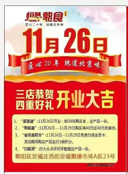 恒慧快訊:恒慧熟食定福莊店11月26號(hào)盛大開(kāi)業(yè)!義賓店,宏成店,五里倉(cāng)店三店恭賀開(kāi)業(yè)大吉!東興店,勁松店開(kāi)業(yè)在即!駝房營(yíng)店籌備中!醬牛腱:牛腱筋多多!貨真??;無(wú)敵豬蹄:去大骨、帶蹄筋,筋道爛糊,性?xún)r(jià)比太高啦!“恒慧熟食”,“慧”享美好生活?。?/p>