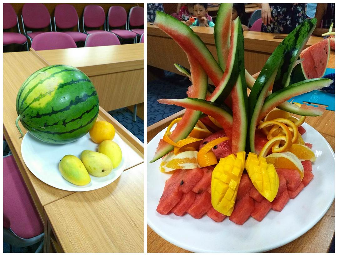 這次培訓,林師傅教了我們?nèi)绾沃谱骱唵我讓W的水果拼盤,也給我們演示了西瓜家常的切法。一個水果拼盤不到二十分鐘制作完成,所以,炎炎夏日,朋友聚會,家宴待客,那就來一盤清涼解渴又營養(yǎng)的水果拼盤吧。