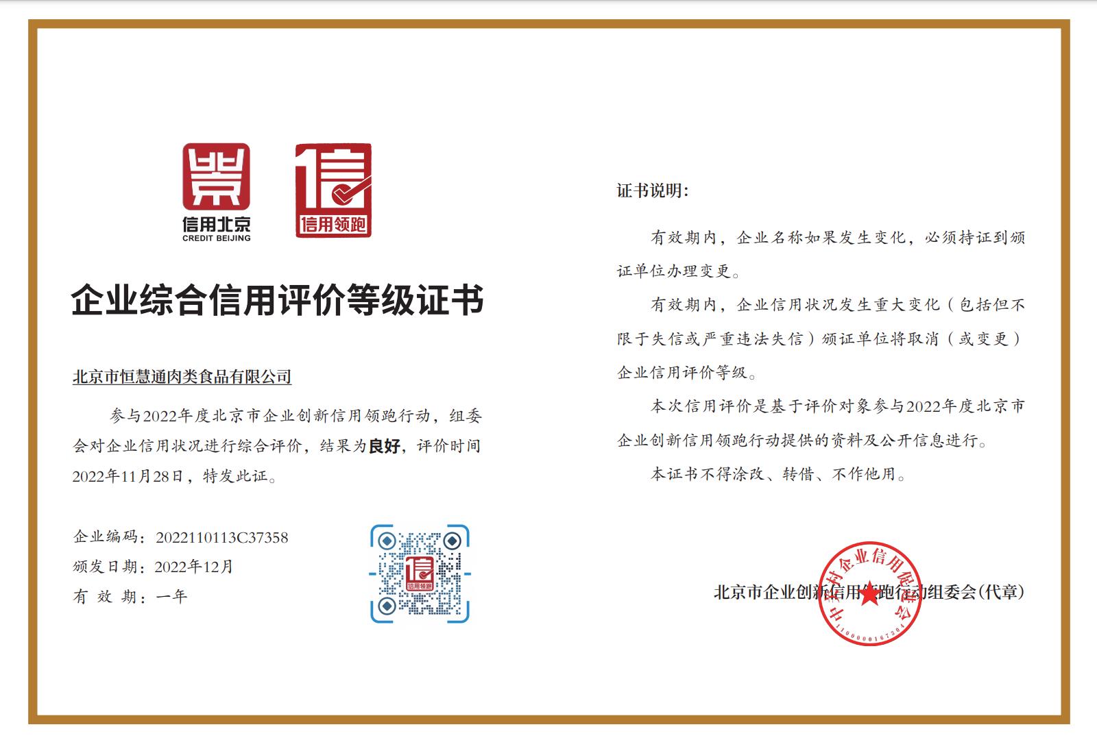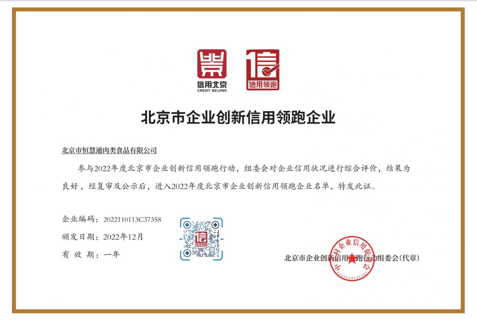 12月16日,在2022信用北京(第八屆)信用中關(guān)村高峰論壇暨京津冀(晉)信用協(xié)同交流會(huì)上,2022年度北京市企業(yè)創(chuàng)新信用領(lǐng)跑名單正式發(fā)布!在經(jīng)歷了企業(yè)申報(bào)、信用評(píng)價(jià)、專家復(fù)核、社會(huì)公示等工作程序后,347家企業(yè)、6家產(chǎn)業(yè)園區(qū)、5家商務(wù)樓宇正式成為2022年度信用領(lǐng)跑企業(yè)、信用領(lǐng)跑園區(qū)和信用領(lǐng)跑樓宇。其中北京市恒慧通肉類(lèi)食品有限公司榮獲“2022年北京市信用領(lǐng)跑企業(yè)”。